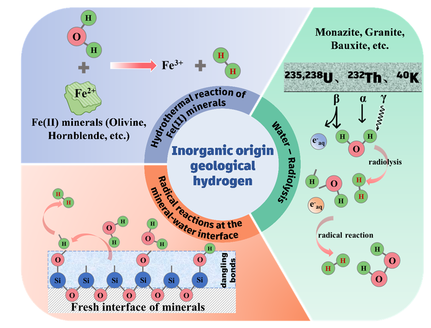 研究指出,含F(xiàn)e(II)礦物水熱反應、水輻射分解以及礦物-水界面自由基反應是無機來源地質氫的三種主要形成途徑,其全球年產(chǎn)氫率分別為0.2×1011–6.3×1012 mol/year,1.6×1010–1.35×1013 mol/year,和1.1×108–2.5×1010 mol/year。含F(xiàn)e(Ⅱ)礦物水熱反應的核心機制是Fe(II)的電子轉移與礦物相變,主要受溫度控制;水輻射分解則通過天然放射性元素輻照水分解生成氫,主要受輻射類型和劑量影響;而礦物-水界面自由基反應主要來源于界面水分子在不飽和配位位點反應形成自由基并進一步生成氫氣,其主要受礦物類型控制。上述反應還受到共存離子、水溶氣體等地質環(huán)境條件的共同調控。