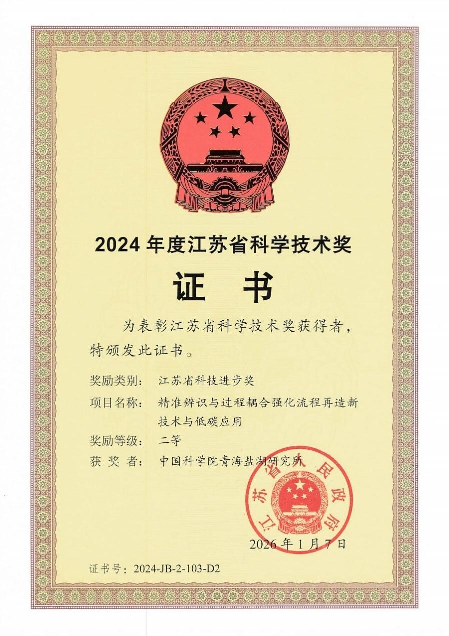 近日,江蘇省人民政府發(fā)布《關于2024年度江蘇省科學技術(shù)獎勵的決定》(蘇政發(fā)〔2026〕2號),由中國科學院青海鹽湖研究所作為第二完成單位參與完成的“精準辨識與過程耦合強化流程再造新技術(shù)與低碳應用”項目,榮獲2024年度江蘇省科技進步二等獎。